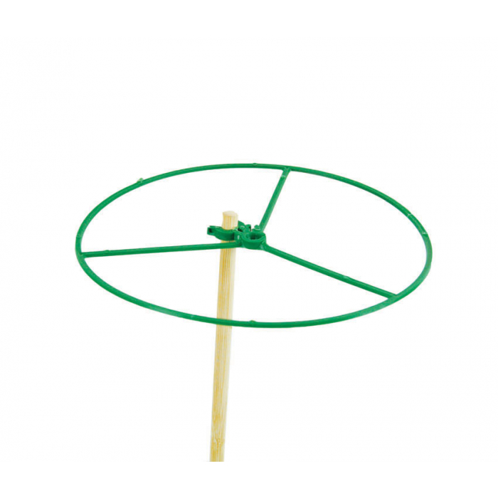 Deze 15 cm plantensteunring kan worden bevestigd aan bijvoorbeeld een splitbamboe met een diameter van 3,5-7 mm. Model met spaken en bevestiging voor de stok in het midden van de ring.