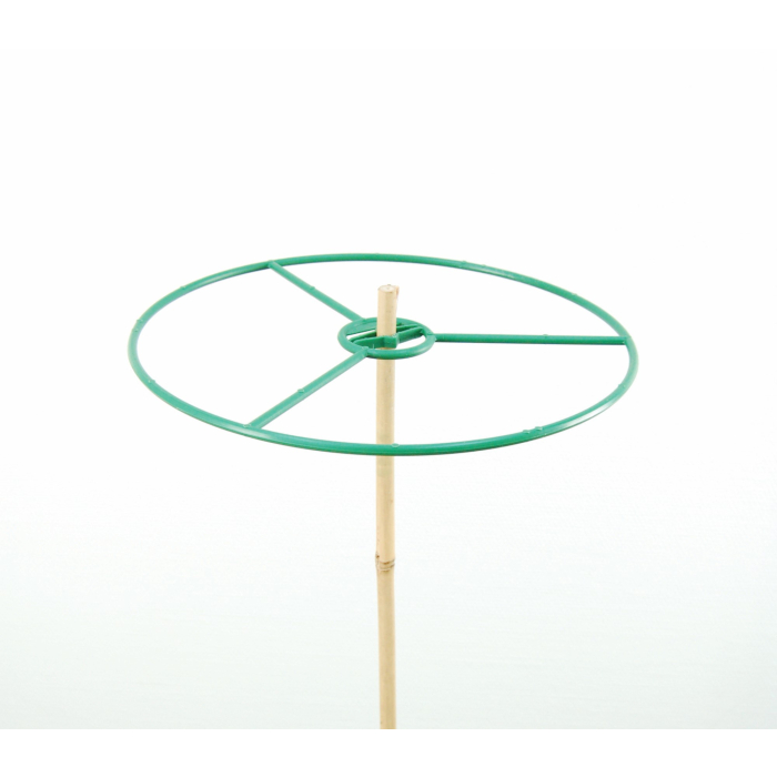 Deze 30 cm plantensteunring kan worden bevestigd aan bijvoorbeeld een splitbamboe met een diameter van minimaal 10-12 mm. Model met spaken en bevestiging voor de stok in het midden van de ring.